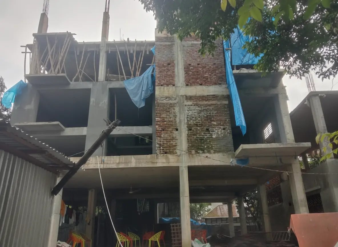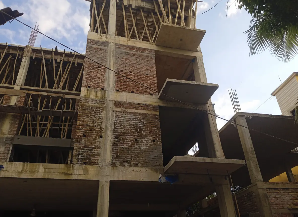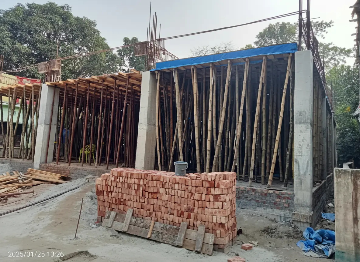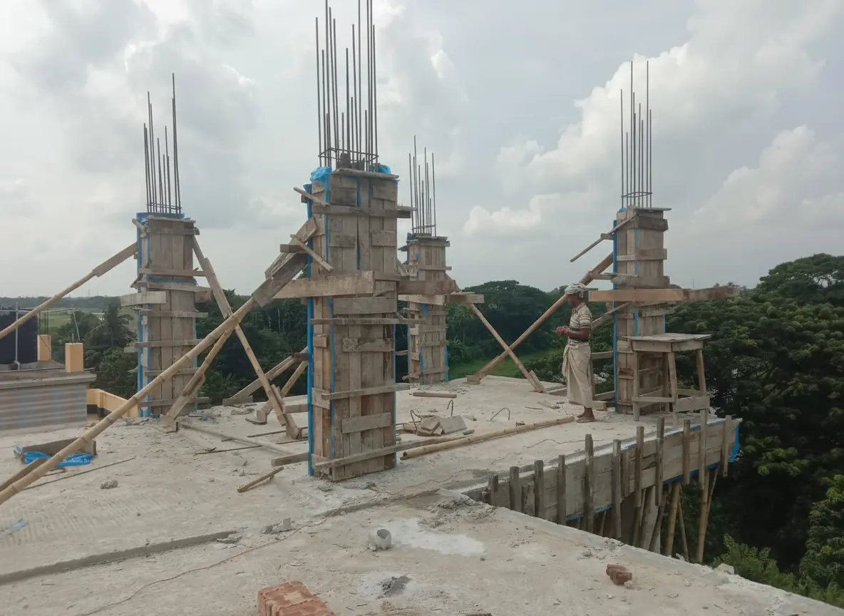As the foundation cures, the project transitions to the superstructure, the visible part of the building that defines its form and function. The vertical ascent is marked by the construction of columns and slabs. For each floor, temporary support structures, known as shuttering or formwork (Image 3), are erected to hold the wet concrete until it gains sufficient strength. This is a crucial step, and our use of high-quality materials and bracing ensures the dimensional accuracy of all structural elements.