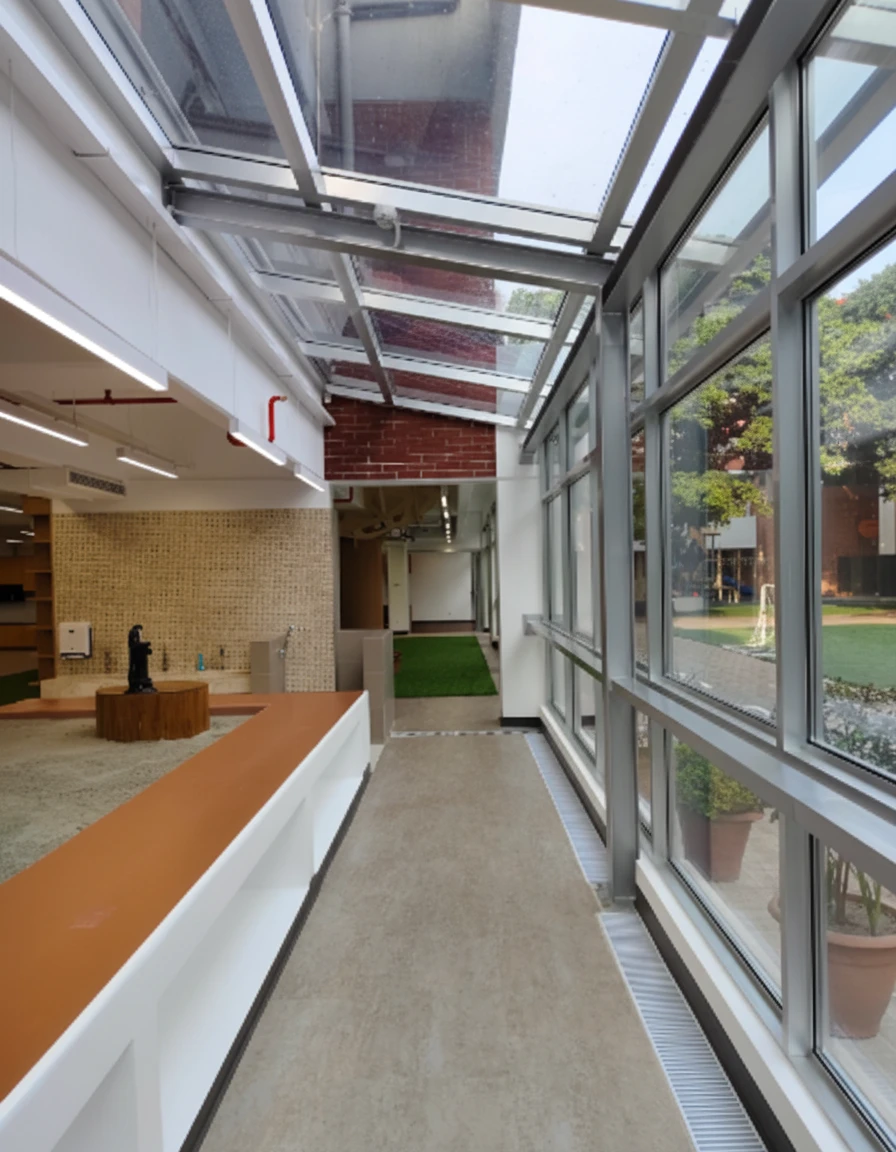 These glass-enclosed walkways feature a transparent roof and walls, creating a seamless connection between the indoor and outdoor environments. The use of glass ensures that even on overcast days, the interior spaces are flooded with natural light, promoting a sense of well-being and reducing the need for artificial lighting. The corridors are not merely passageways; they are light-filled galleries that offer glimpses of the beautifully maintained gardens and outdoor play areas, making the journey between spaces an enjoyable experience.